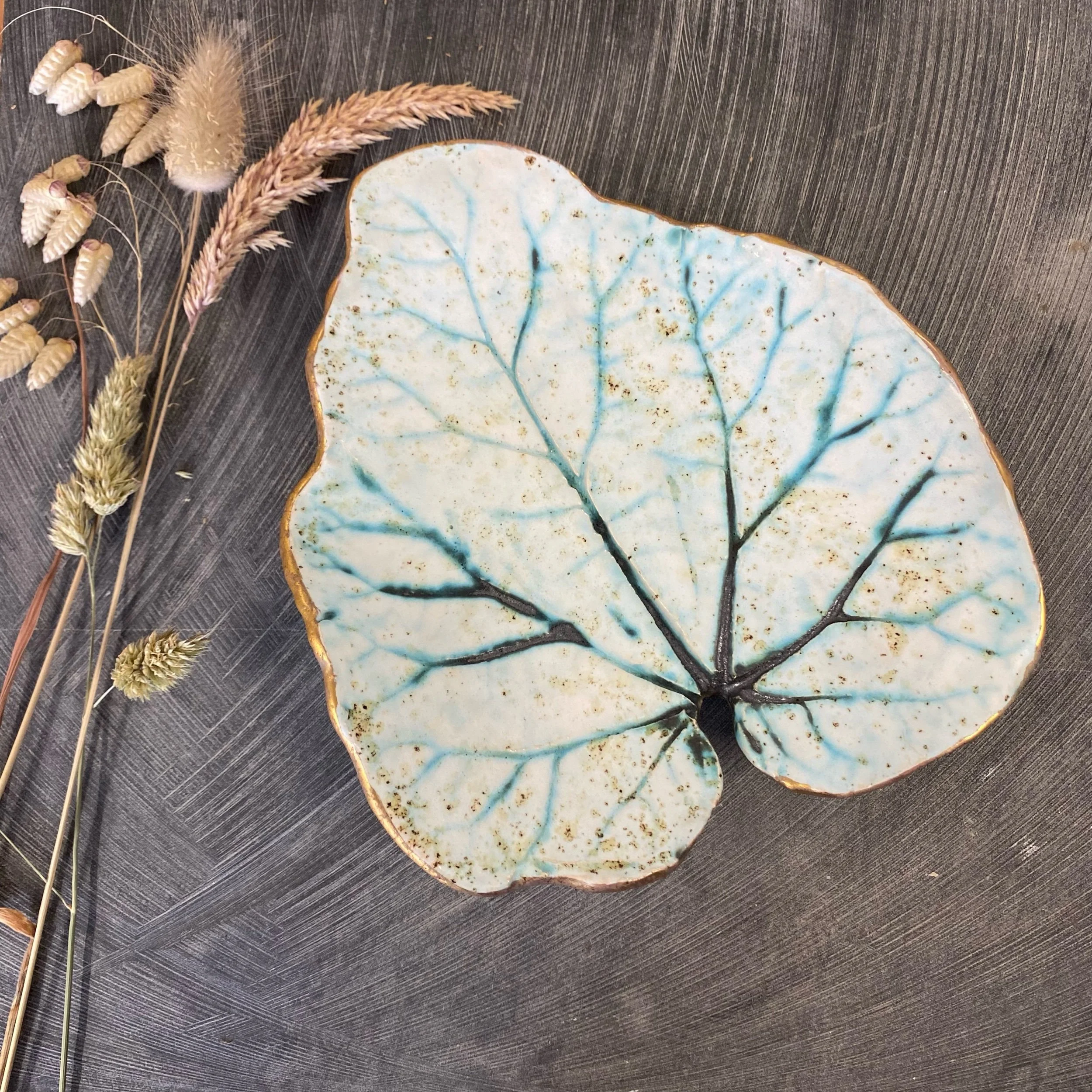 Fired and then painted with copper oxide and glazed. Finally adding 22k gold lustre applied and fired for a 3rd time.